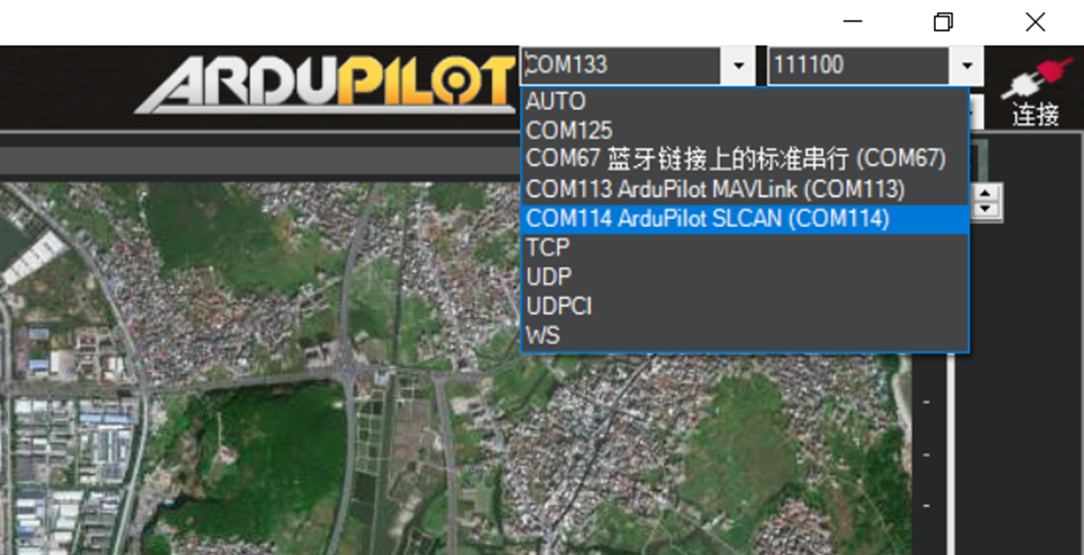 使用Type-C数据线把飞控与电脑连接,在MP软件右上角选择飞控对应的端口,如下图: