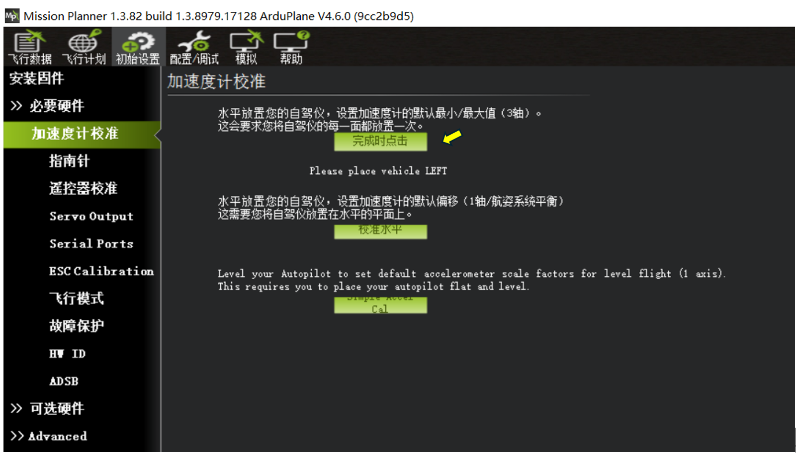 Please place vehicle LEFT加速计校准--左面朝下, 如下图