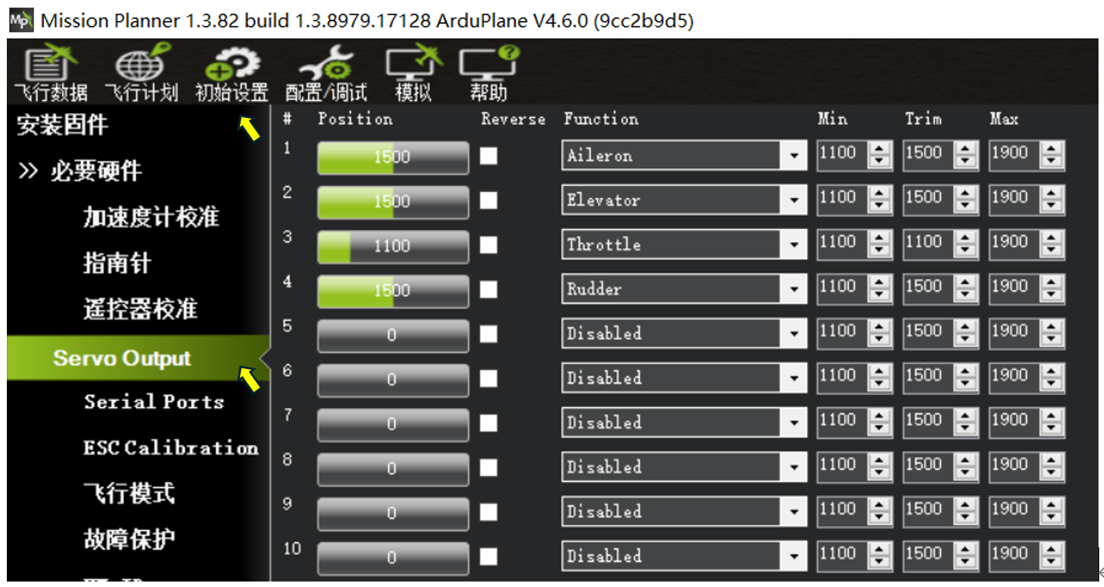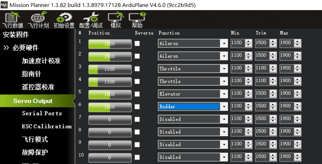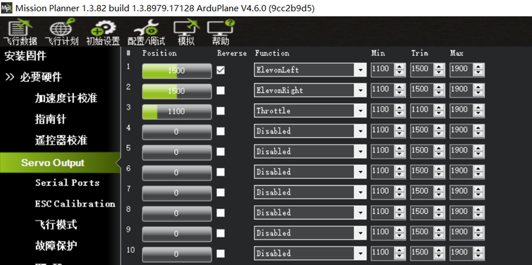 Ardupilot的通道输出为实时输出,后期进行通道辅助修正调整的时候,发现飞控执行飞机姿态修正的时候,通道输出方向错误,在对应通道的"Reverse"处勾选,对应通道的输出即可反向。