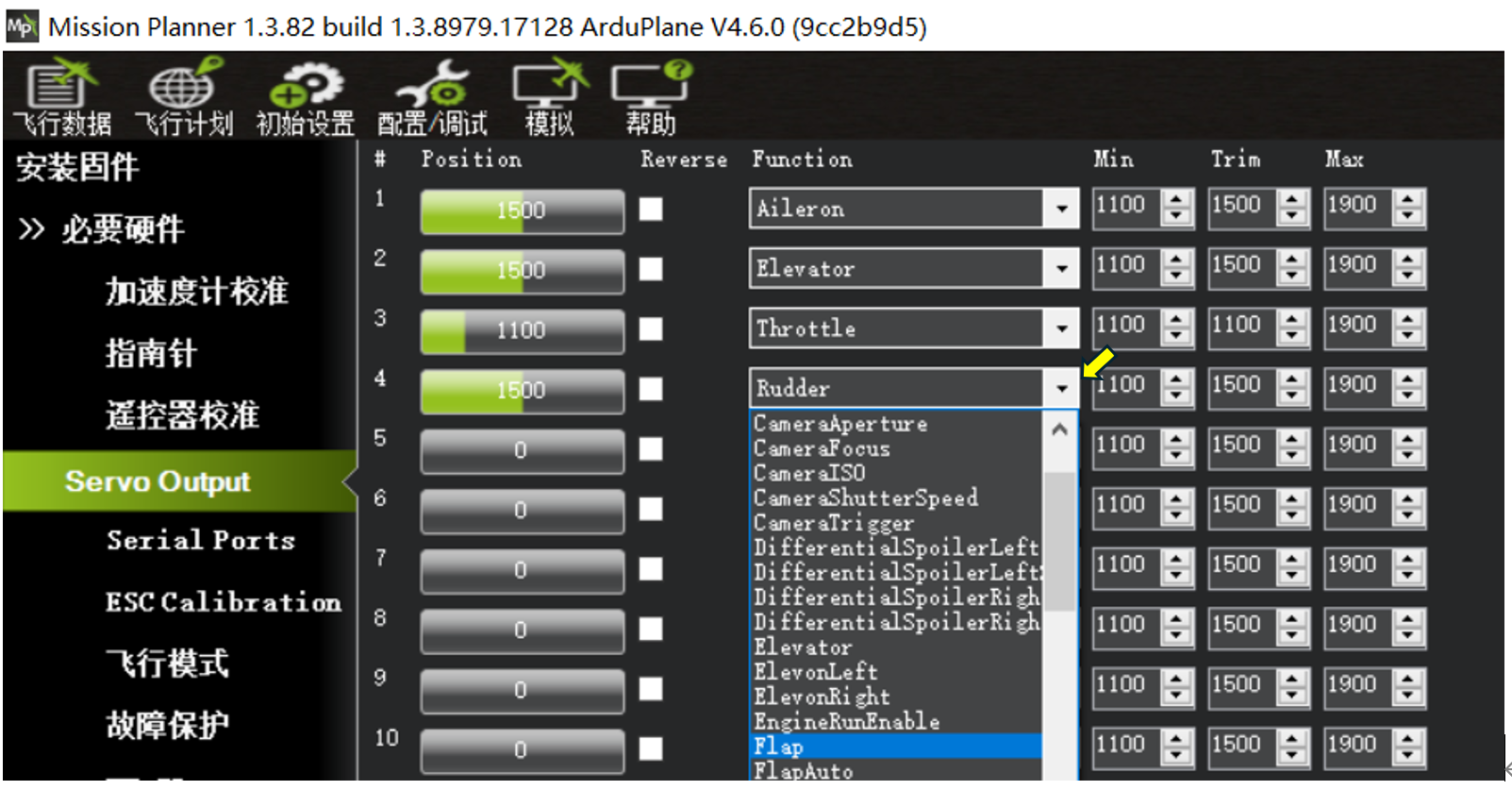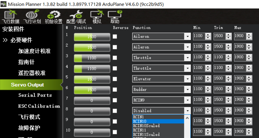 每个Servo输出通道都可以在对应的下拉菜单中选择定义,这是Ardupilot固件最有特点的地方之一。修改Servo的自定义设置,需要重启飞控才能生效。 我们常见的定义类型如下: