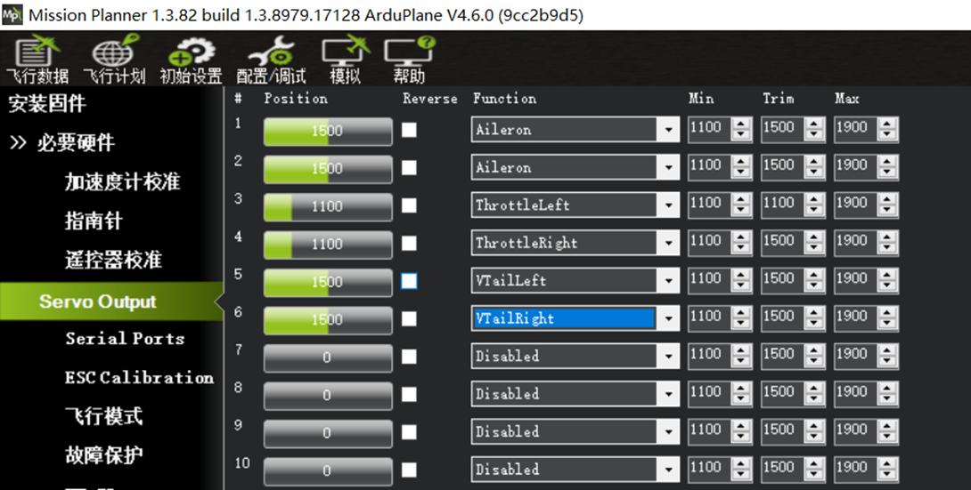举例2:用户装一台3D打印飞机的双发V尾机型,使用双电机差动控制。副翼2个舵机接在S1,S2。则#1、#2都可以设置为Aileron。S3接左边机翼的电调信号,则#3设置为ThrottleLeft。S4接右边机翼电调信号,则#4设置为ThroleLeft。S5接V尾的左舵机,#5设置为VTailLeft,S6接V尾的右舵机,则#6设置为VTatlRight。