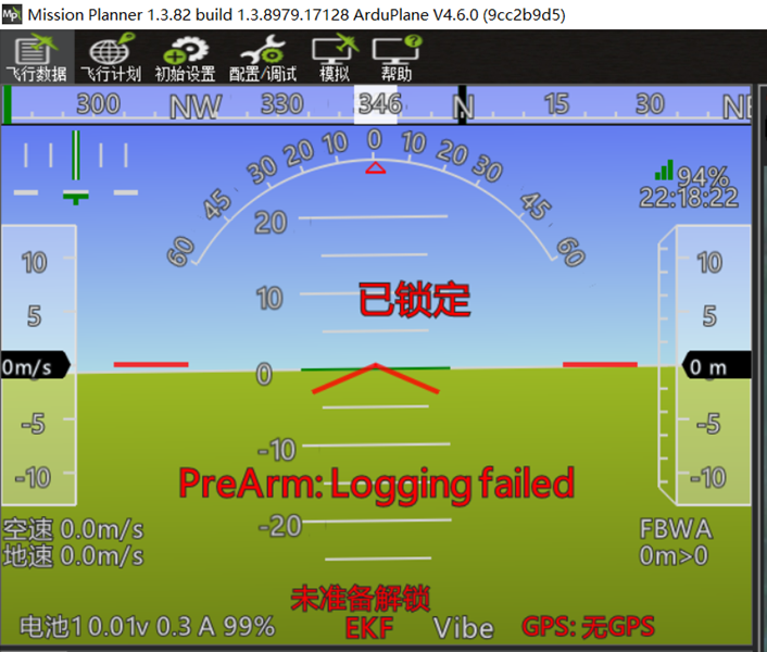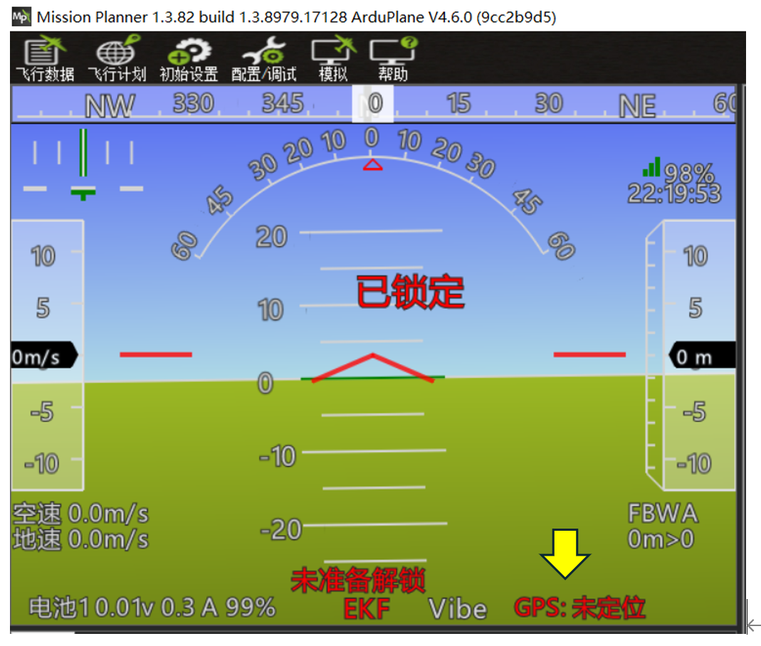如果GPS连线错误,串口设置错误,或者GPS本身兼容性问题或者质量问题。飞控无法正确识别GPS,姿态仪框右下角则显示: GPS: 无GPS 红色字样。