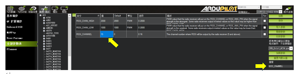 以下用ELRS接收机对应的RSSI通道:15通道 进行设置。全部参数表中搜索:RC15 如下图 (思翼接收机搜索RC16, 黑羊接收机搜索 RC12)