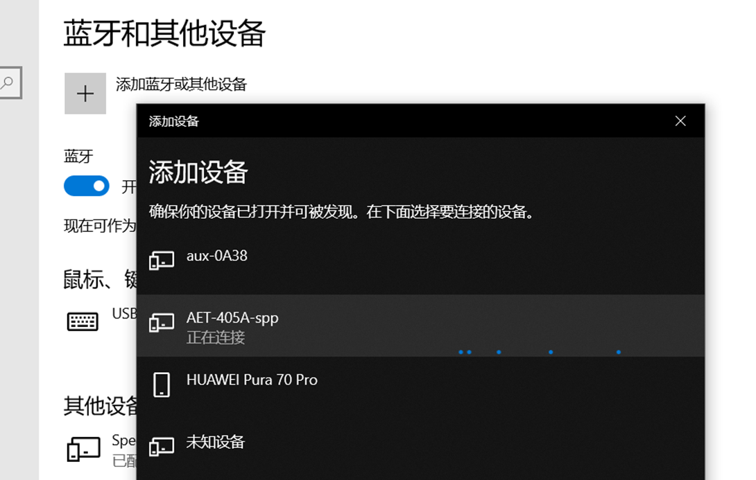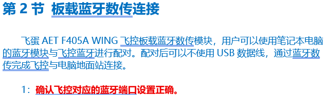 2:断开USB线连接,飞控接上动力电池。等待飞控完成启动自检后,在电脑的蓝牙和其他设备页面,点击连接AET-F405A-spp。