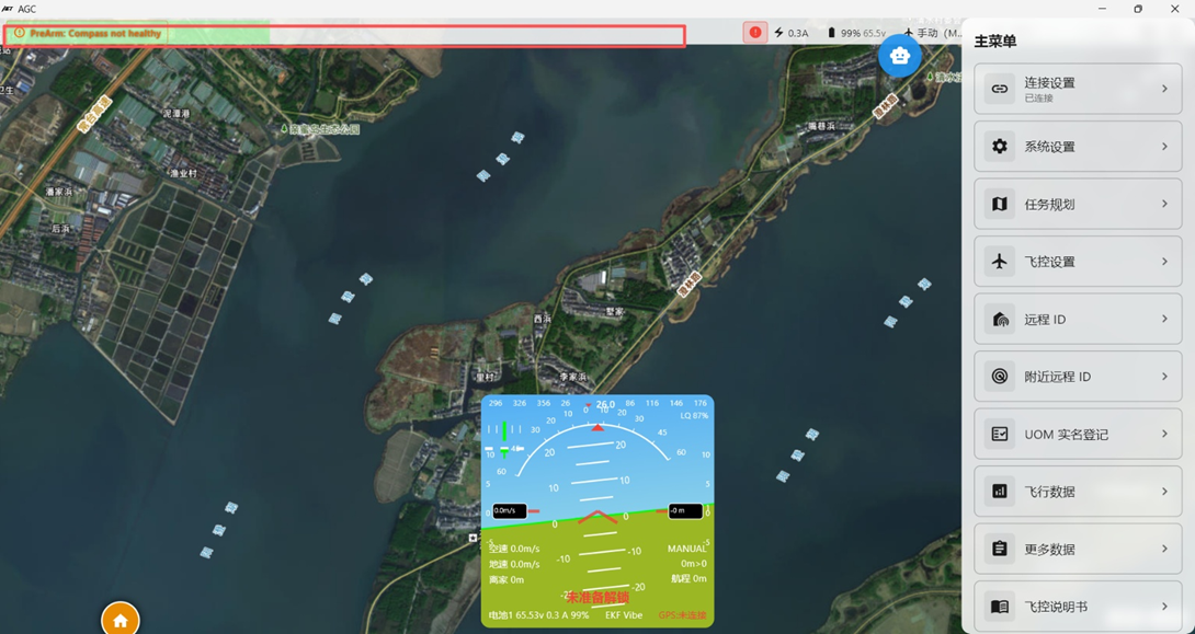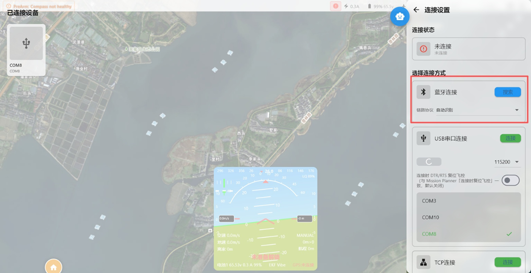 3:在确认已经对蓝牙连接分配端口编号后(不同玩家的蓝牙连接可能生成的端口编号会不同,根据实际情况选择)。打开Mission Planner调参软件。在右上角端口下拉菜单选择蓝牙设备的端口。点击连接。