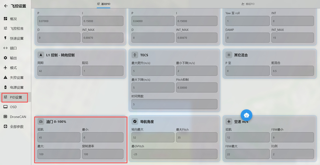 调整巡航油门 模友反馈,飞机在返航到头顶后,经常出现油门100%输出高速盘旋,为此我们建议在MP的基本调参页面中适当修改