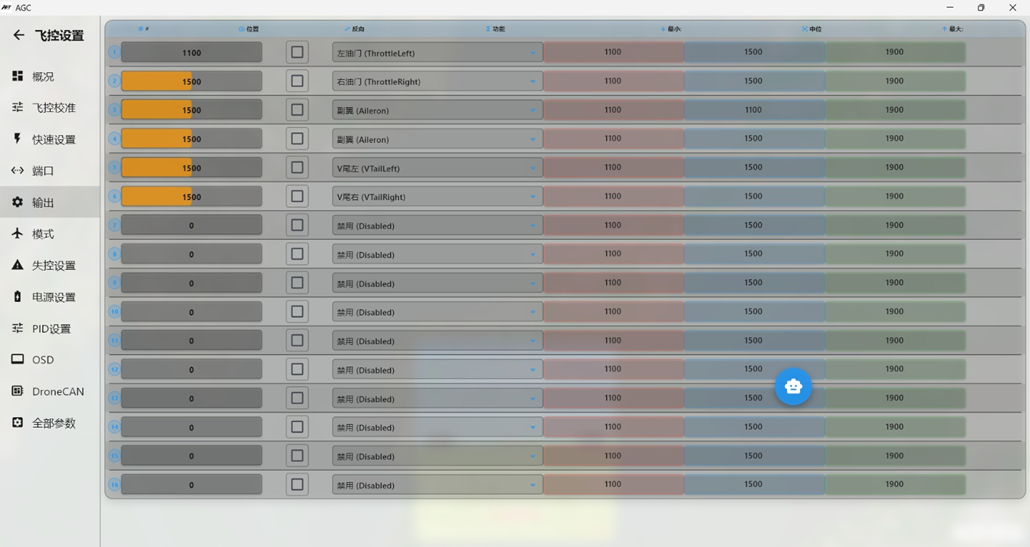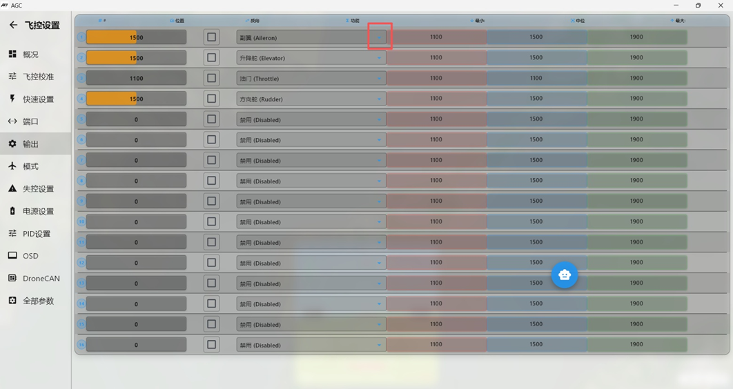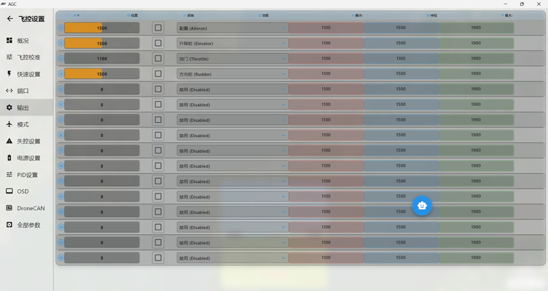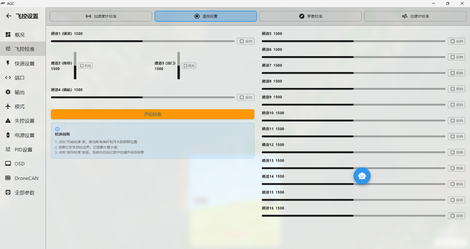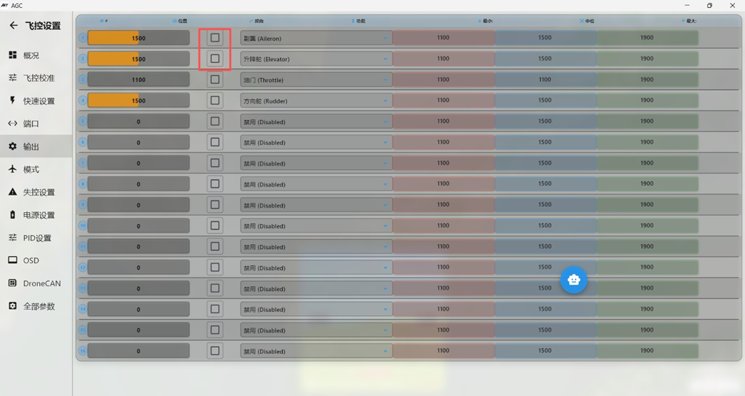 AGC的通道输出为实时输出,后期进行通道辅助修正调整,发现飞控执行飞机姿态修正的时,通道输出方向错误,在对应通道的"反向"处勾选,对应通道的输出即可反向。