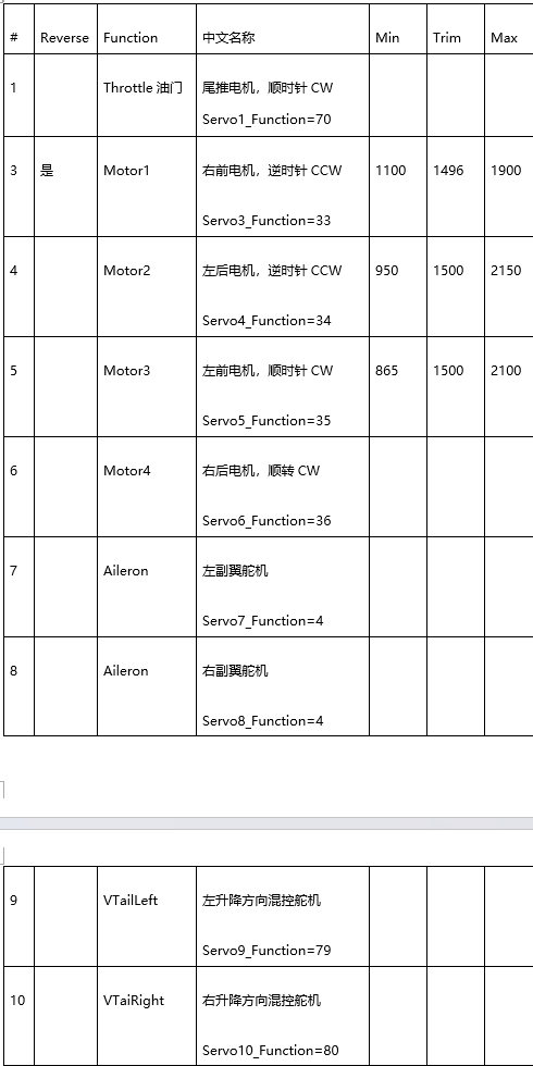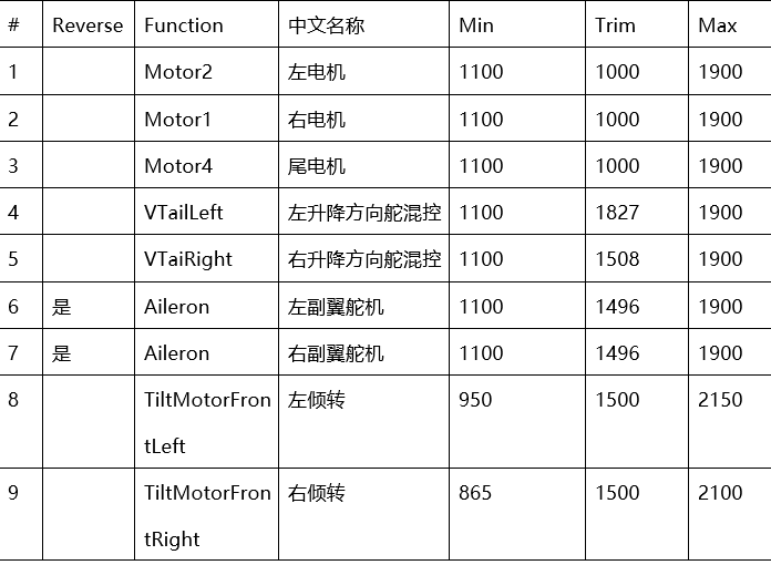 倾转角度,通过调整Servo9_Min、Servo9_Max、Servo10_Min、Servo10_Max的值。