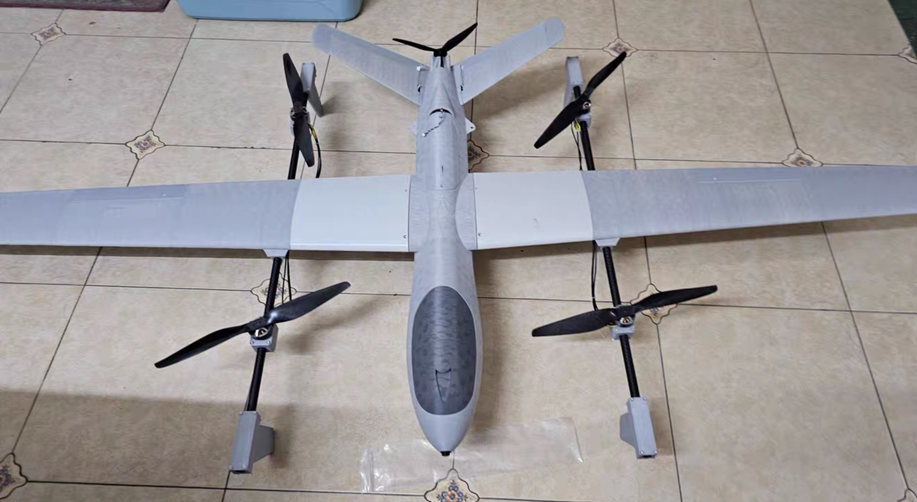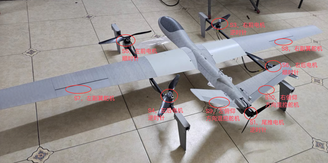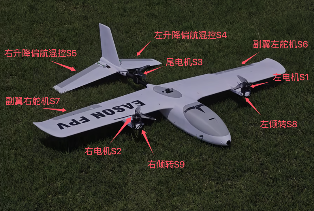 信天翁是双发垂直尾翼的标准固定翼飞机,改垂直起降固定翼后,共4个电机,前2个电机通过舵机设置倾转,没有尾推电机。 Servo1:左副翼
