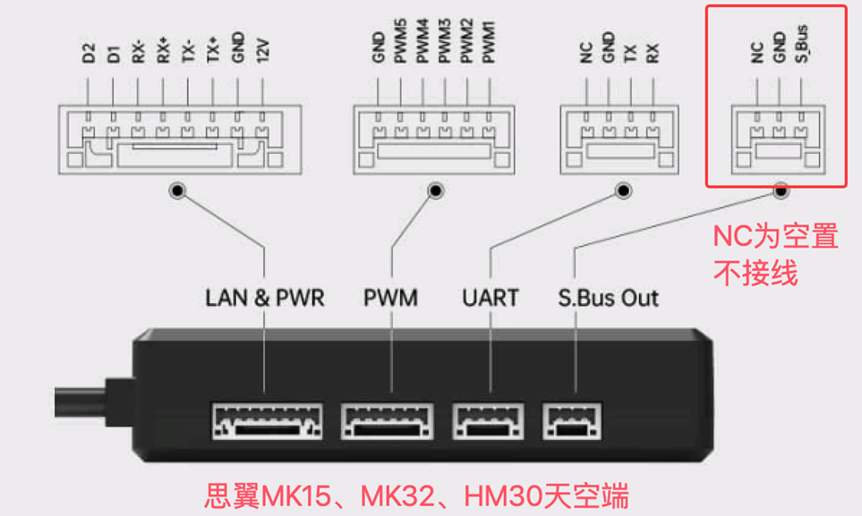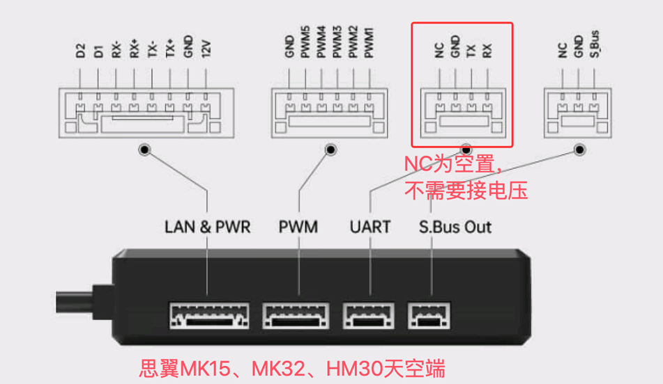 如果使用思翼数图遥一体模块,用GH1.25-3Pin转2.54杜邦3Pin信号线,飞控端接到SERIAL PORT6(即UART6)的RX6-GND;思翼天空端接到S.Bus Out接口(NC线剪断不连飞控),MP调参软件中设置波特率为115200、协议为RCIN。(同时思翼MK15遥控器,思翼遥控APP--数传设置,串口波特率设置为115200,飞控为自定义,连接为UDP或串口)。