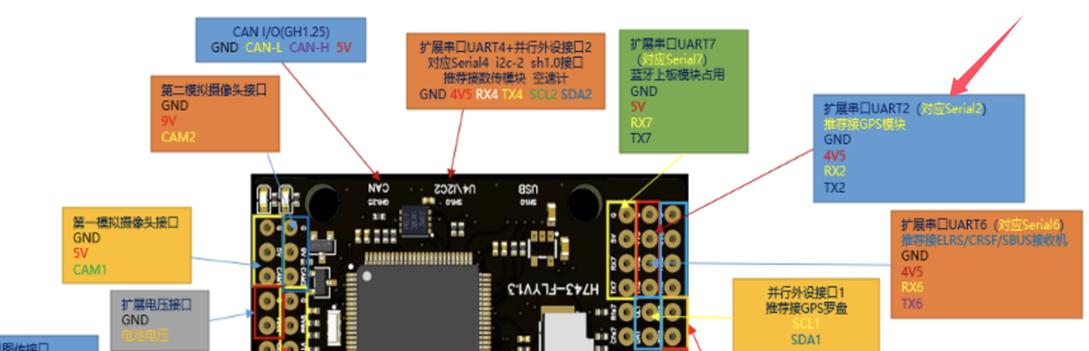 GPS需要使用2.54杜邦 4P/6P(含罗盘)接口 ,接入飞控的SERIAL PORT2(即UART2接口,线序为SDA1-SCL1-TX2-RX2-4V5-GND),(接线图跳转)。多数GPS的参数一般为38400 GPS。部分GPS模块的Speed波特率值可以到115200。(无罗盘的GPS只接4根线,即TX RX 5V GND)