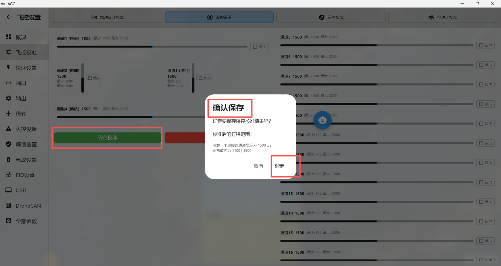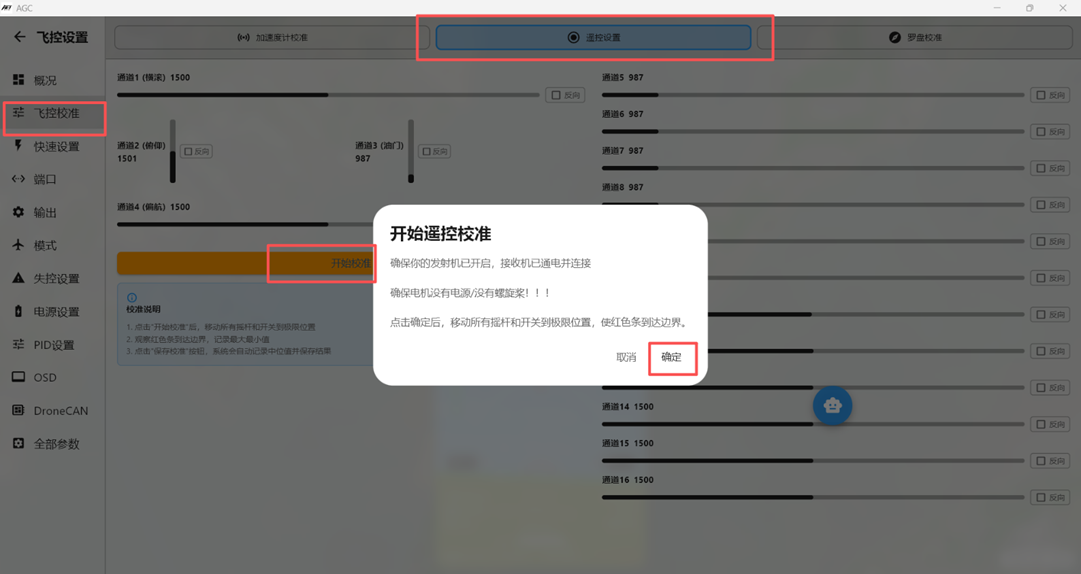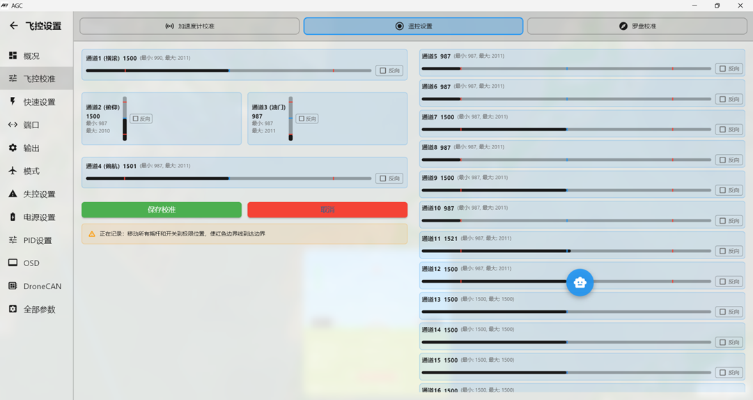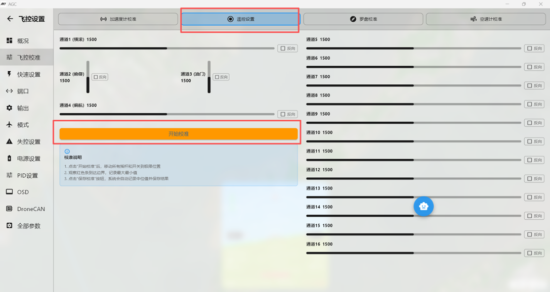 操作说明:请将遥控器上所有可用通道(包括打杆、油门拨杆等)全部推至最大行程位置,保持片刻后再逐一回中复位