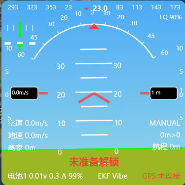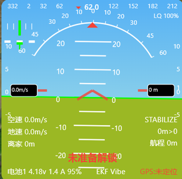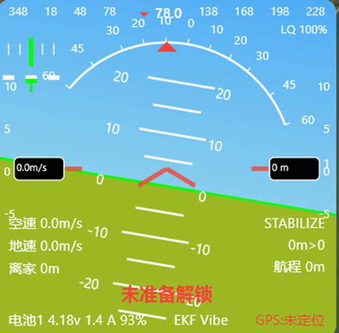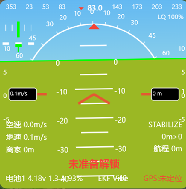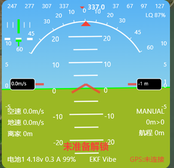 如果GPS连线错误,串口设置错误,或者GPS本身兼容性问题或者质量问题。飞控无法正确识别GPS,姿态仪框右下角则显示: GPS: 未连接 红色字样。
