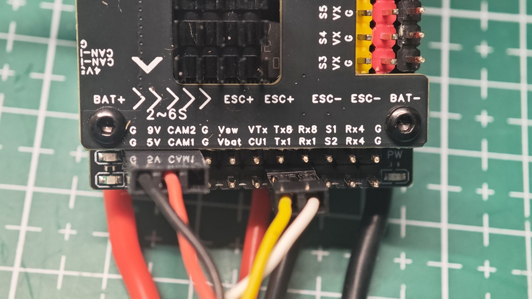 电调信号线接口一般为2.54杜邦3P接口(但杜邦3P接口的中间一般空置),信号线深色或黑色一般为G(GND),对应连接飞控的S1~S12接口,浅色或白色为电调控制信号线S。