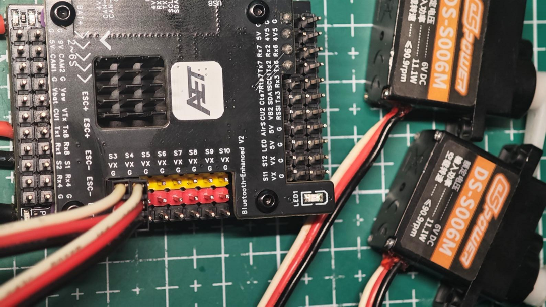 舵机接口一般为2.54杜邦3P接口,舵机线深色一般为G(GND)、红色或橙红色线为舵机供电正极5V,白色或橙黄色线为舵机控制信号线S。每个舵机分别连接飞控的S3~S12接口,不要将舵机线合并到一根再连接飞控。