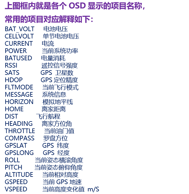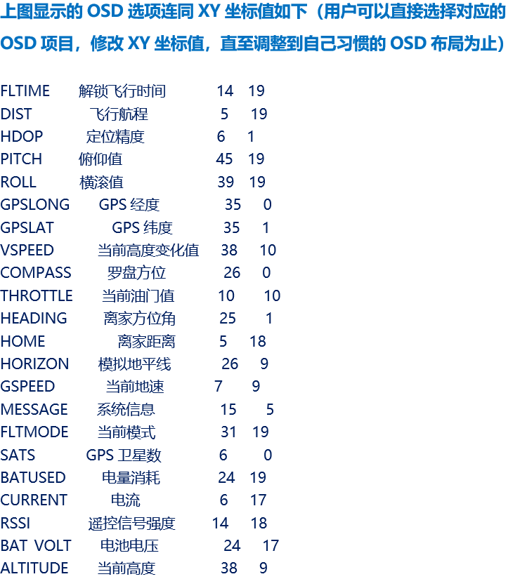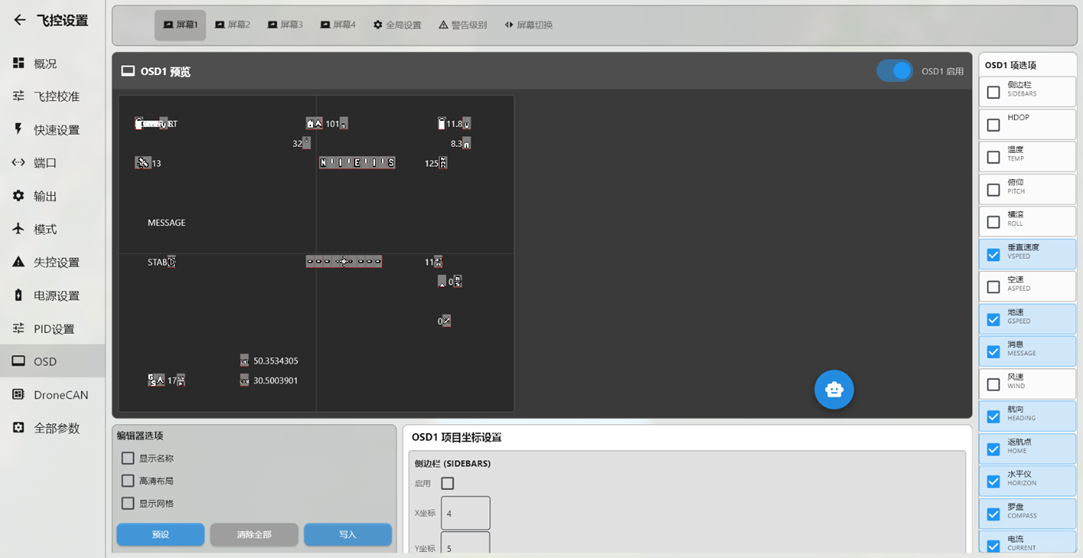 AGC的OSD显示设置与INAV调参有些类似(飞控内置OSD模块),属于最下面的OSD内容选项中勾选需要显示的项目,在页面中拖动到自己想要的位置即可。飞控通电并接入图传与摄像头时,拖动OSD项目的位置,点击写入,即可在接受屏幕中看到OSD信息位置的更新