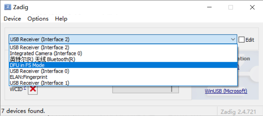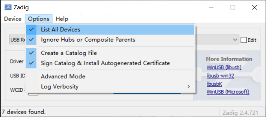 点击运行Zadig软件,点击Option,勾选下拉菜单第一项List All Devices