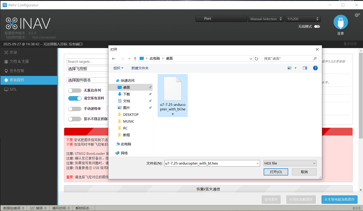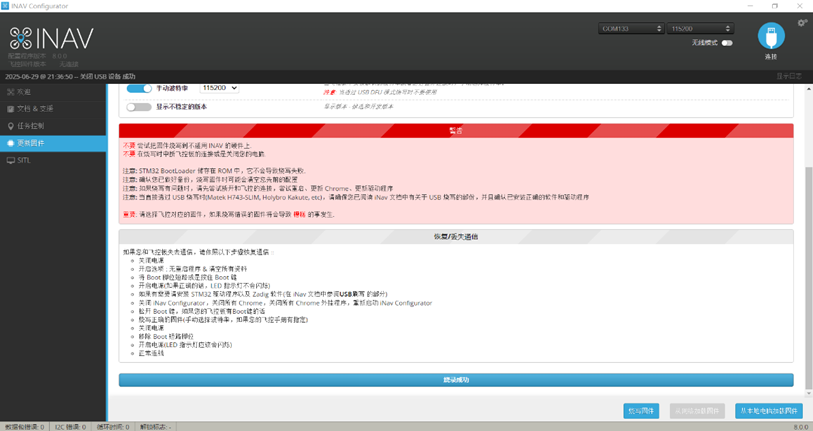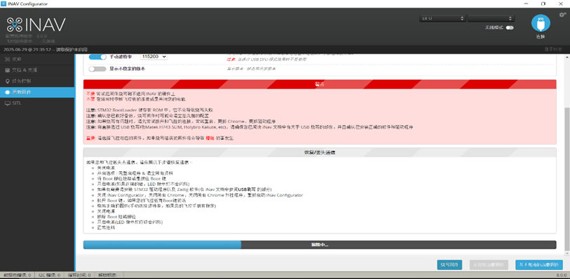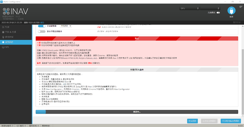 注意:飞控固件烧写全过程,请断开所有串行总线外设连接。包含SBUS接收机,ELRS接收机,CRSF接收机,GPS模块,数字天空端,数传。