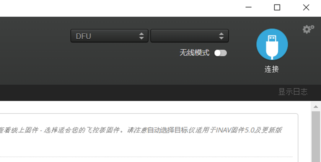 按住飞控的Boot按键不放,使用USB-TYPEC数据线把飞控与电脑连接,正常连接成功,INAV地面站右上角出现DFU表示,即可进入固件刷写。