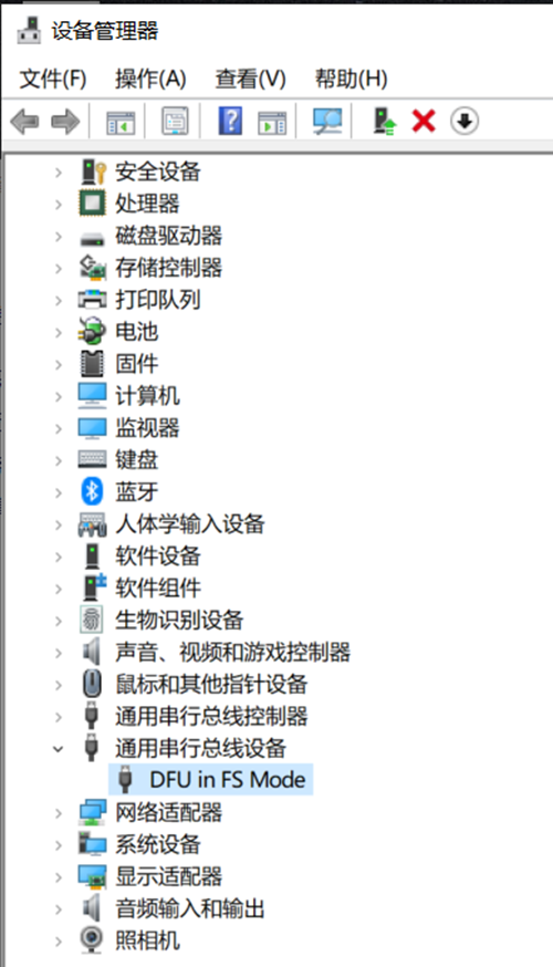部分用户的电脑有可能因为驱动问题无法识别DFU模式,此时先在电脑系统的“设备管理器”查看“通用串行总线设备”—是否有“DFU in FS Mode”设备。