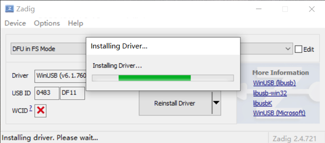 点击 Reinstall Driver 或者Upgrade Driver 安装驱动 等待驱动安装。安装完成,断开飞控USB连接。重新按Boot键不放连接USB,即可正常识别DFU模式